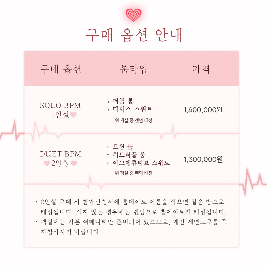 - 객실: 1인실, 2인실 (각 룸타입 내 세부 객실은 랜덤 배정됩니다.)
